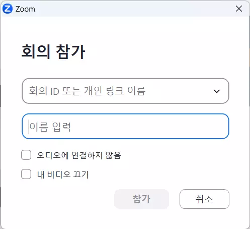 • 회의 참가버튼을 누르시고 회의 ID(보통 11자리 숫자) 또는 초대링크를 입력하거나 클릭합니다.